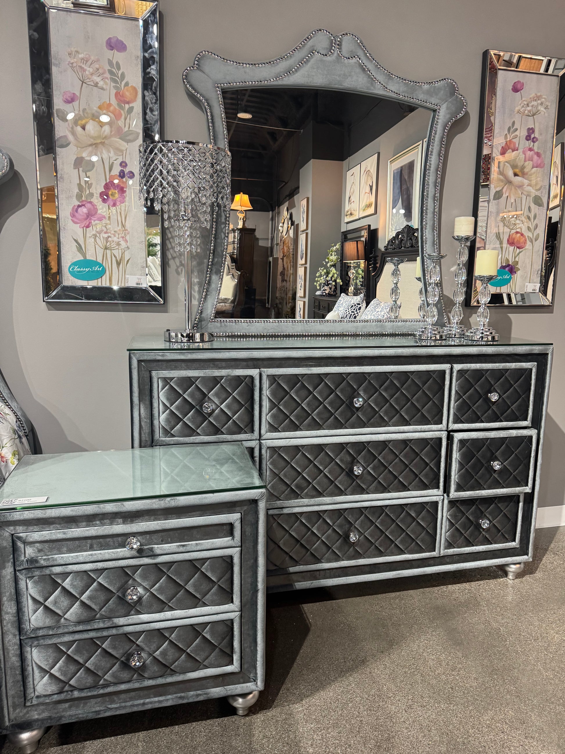 Indulge in the opulence and luxury of this exquisite bedroom collection, where classic glamour meets contemporary design. The grandeur of the tufted, upholstered headboard is framed by an elegantly sculpted silhouette, complemented by the plush finish that graces both the bed and the accompanying case pieces. Crystal accents and intricate patterning on the drawer fronts add a touch of sparkle and intricate detail, while the polished silver-tone handles and feet provide a striking contrast to the chic grey palette.