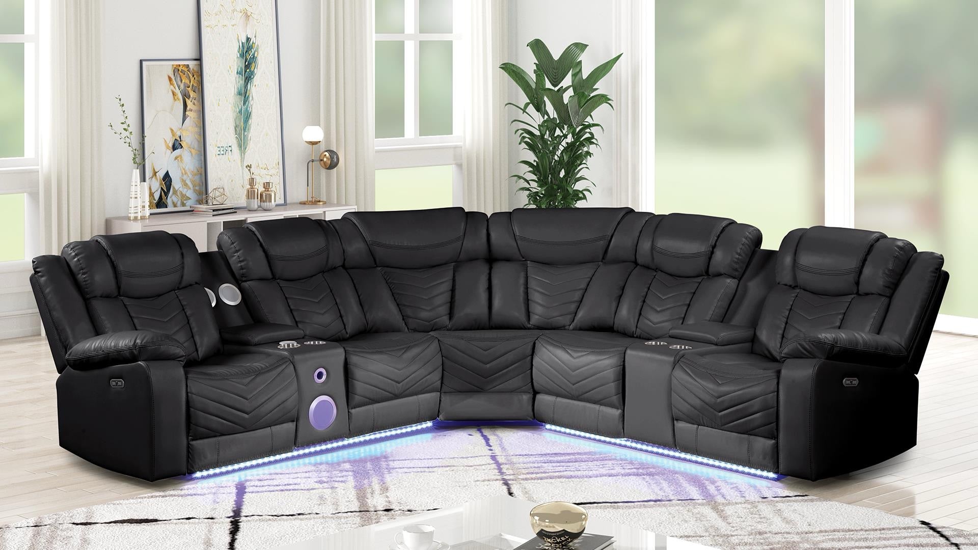 Experience ultimate comfort and convenience with the Challenger Sectional Sofa. This expertly designed sectional features three power recliners, allowing you to adjust your seating position effortlessly. Integrated Bluetooth speakers deliver immersive sound for your favorite music or movies, while built-in cupholders keep your drinks within easy reach. Perfect for modern living rooms, this sofa combines advanced functionality with stylish design to enhance your relaxation and entertainment experience.