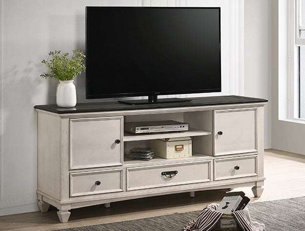 This entertainment console epitomizes timeless elegance, with its classic silhouette and refined antique finish. The 2 toned finish includes detailed molding and vintage-inspired metal hardware, offering a luxurious feel to the room. 2 sliding doors provide access to hidden and open shelving while lower drawers offer even more storage