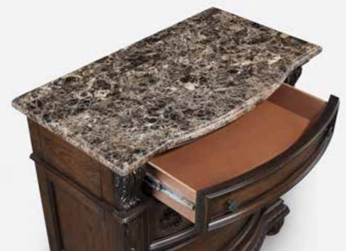 Step into a world where classic elegance meets timeless design with our exquisite bedroom collection. Designed for those who covet regal charm and functionality, this suite features rich, natural wood tones that evoke the grandeur of an aristocratic estate. Each piece boasts intricate carvings and moldings, with a stately bed that stands as the centerpiece — its tufted headboard provides a touch of luxury and comfort. The coordinating pieces, including a multi-drawer dresser, a gracefully curved mirror, and a tall chest, all offer generous storage while maintaining the sophisticated aesthetic. Marble tops and antiqued hardware add a final touch of elegance, ensuring this collection will elevate your bedroom into a luxurious retreat.