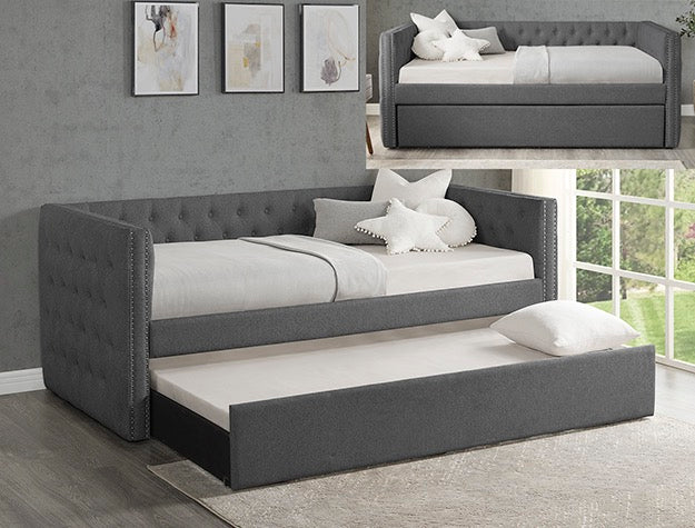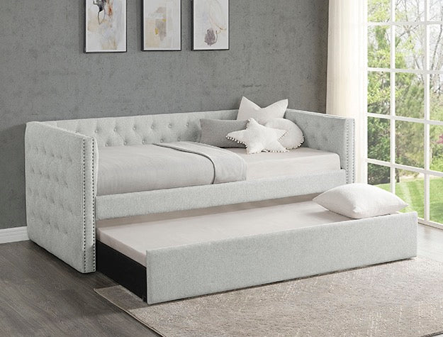 Transform your space with this beautifully designed statement piece, offering both style and practicality in one luxurious package. Upholstered in a soft, textured fabric, this elegant creation features deep tufting for a sophisticated touch, complemented by a chic nailhead trim that exudes refined charm. The sleek, modern silhouette makes it a perfect fit for any décor, while the convenient pull-out trundle provides additional sleeping space, making it ideal for hosting guests in comfort and style. Whether used in a bedroom, guest room, or lounge area, this stunning addition brings effortless elegance and functionality to any home.