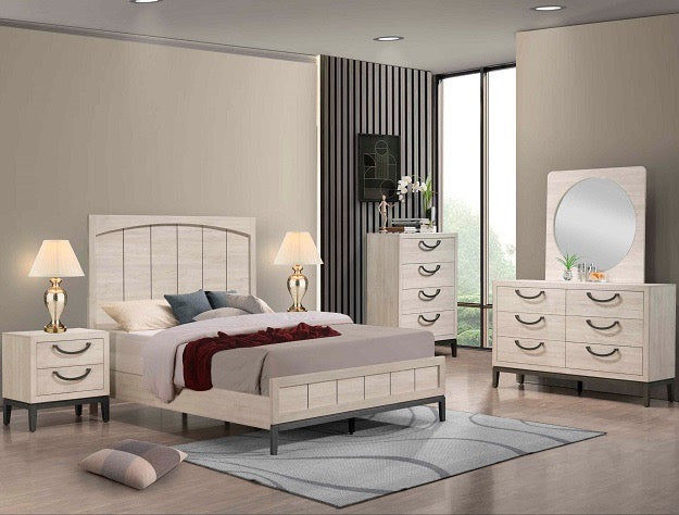 Experience the blend of minimalism and elegance with this chic bedroom ensemble. Crafted with a light and airy finish, it creates an inviting atmosphere while the sleek lines and subtle contrasts in color emphasize a modern aesthetic. Each piece showcases thoughtful craftsmanship with unique drawer pulls that add a touch of character. The gracefully arched headboard anchors the space, offering a serene focal point.